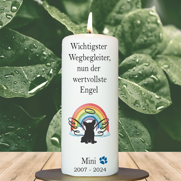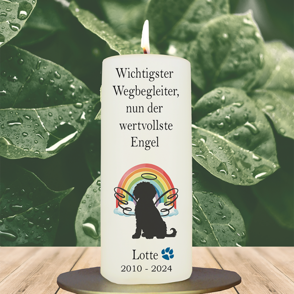 Diese Kerze ist eine Hommage an einen Hund, der nicht nur Haustier war, sondern fester Teil des Herzens. Der Regenbogen als Zeichen des Übergangs, die Engelsflügel als Symbol für das Weiterleben der Seele – all das vereint diese Kerze mit dem bewegenden Text. Mit Name und Lebensjahren personalisierbar, ist sie ein stilles Erinnerungslicht für treue Freundschaft ohne Worte. • Größe (H x B): 15x6cm