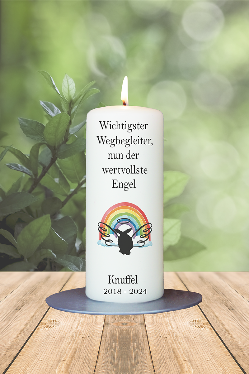 Klein, sanft, geliebt – diese Kerze ehrt das Leben eines Kaninchens, das mit seinem Wesen ein Zuhause stiller, wärmer gemacht hat. Mit Flügeln und Regenbogen gestaltet, würdigt sie die treue Begleitung in kleinen Schritten. Ein Licht für eine zarte Seele, das durch Name und Lebensdaten zu einer bleibenden Erinnerung wird.