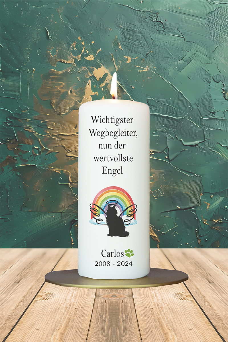 Diese Kerze erinnert an eine Katze, die mehr war als ein Haustier – ein Seelengefährte auf Samtpfoten. Die Engelsflügel, der Heiligenschein und der Regenbogen symbolisieren, dass sie nun an einem friedlichen Ort weiterlebt. Der Text ist liebevoll und aufrichtig, die Kerze mit Name und Lebensdaten personalisierbar – ein Licht für stilles Gedenken, voller Wärme.