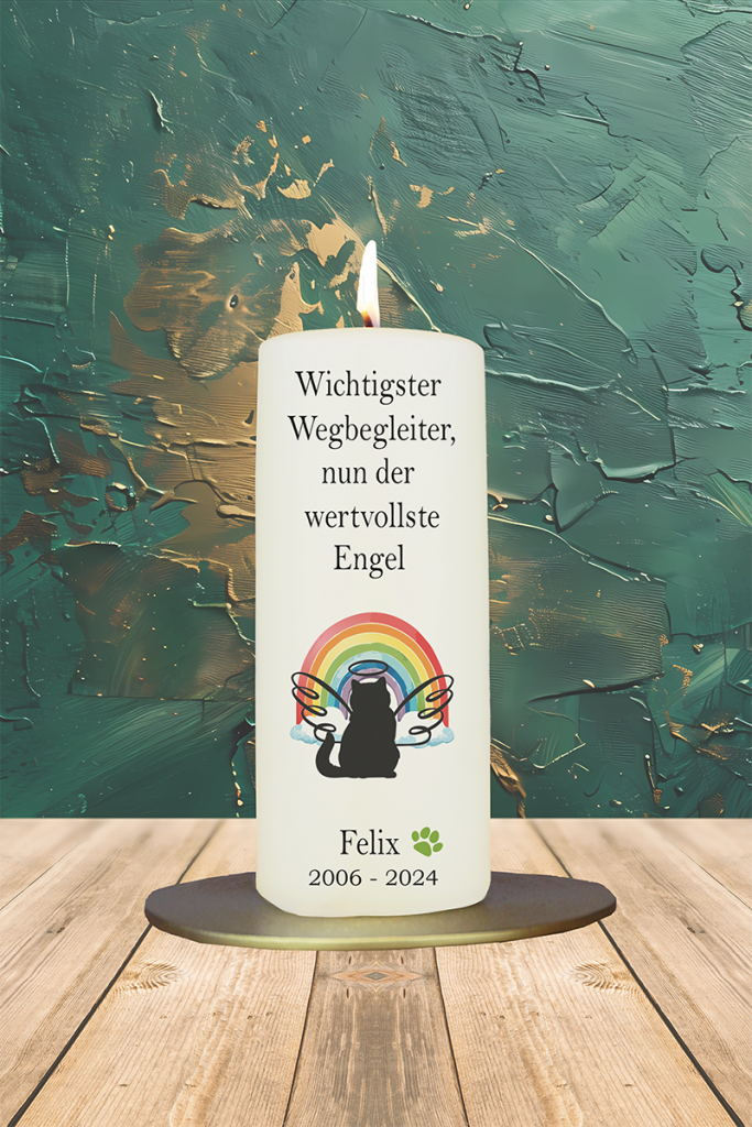 Diese Kerze erinnert an eine Katze, die mehr war als ein Haustier – ein Seelengefährte auf Samtpfoten. Die Engelsflügel, der Heiligenschein und der Regenbogen symbolisieren, dass sie nun an einem friedlichen Ort weiterlebt. Der Text ist liebevoll und aufrichtig, die Kerze mit Name und Lebensdaten personalisierbar – ein Licht für stilles Gedenken, voller Wärme.