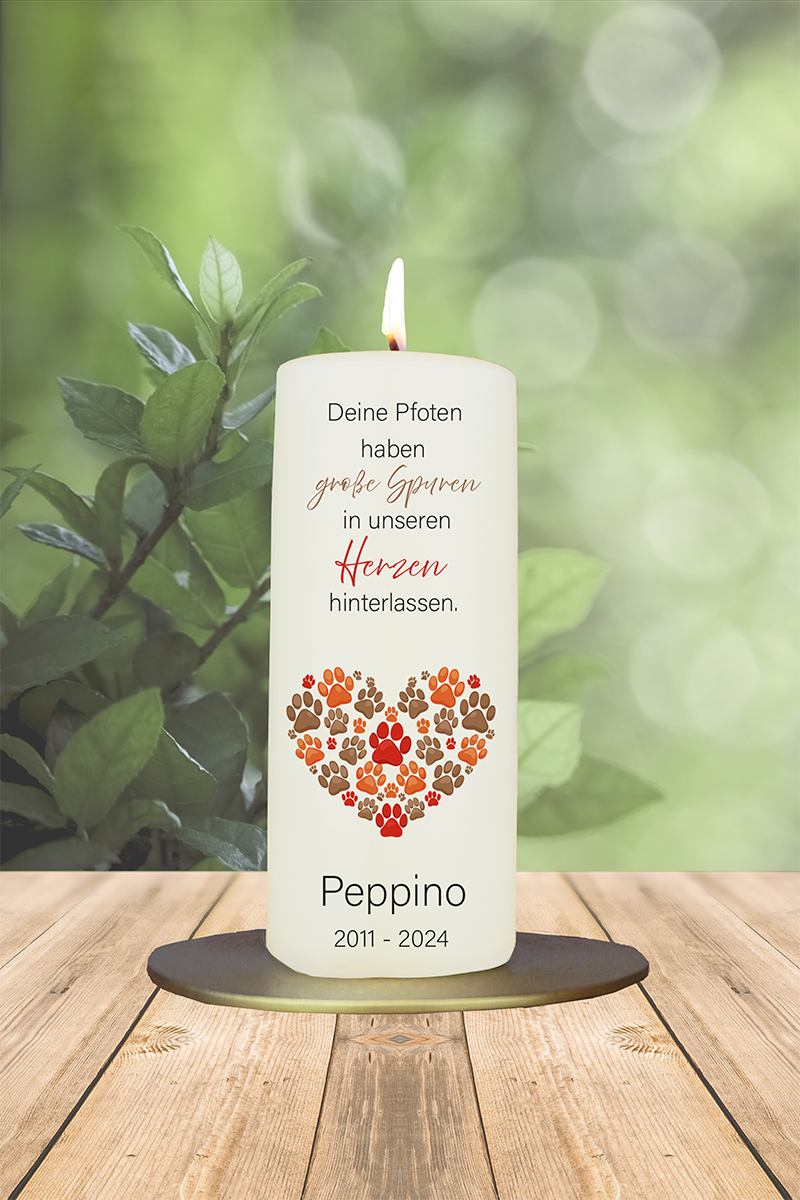 Ein Herz aus zarten Pfotenabdrücken in fröhlichen Farben – diese Kerze zeigt: Erinnerungen dürfen leuchten. Der Text spricht aus, was Katzenliebhaber fühlen: dass jeder Schritt, jede Berührung tief im Herzen bleibt. Mit persönlicher Beschriftung wird daraus ein emotionales Andenken an eine geliebte Samtpfote.