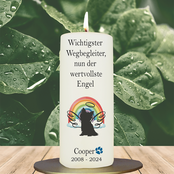 Ein Pfotenabdruck als Fenster in eine friedvolle Landschaft – diese Kerze bringt die Verbundenheit zwischen Mensch und Tier auf eine poetische Weise zum Ausdruck. Der bekannte Trauerspruch lädt zum Innehalten ein. Durch die Personalisierung mit Name und Lebensdaten entsteht ein Licht, das Nähe schafft, wo Lücke geblieben ist.
