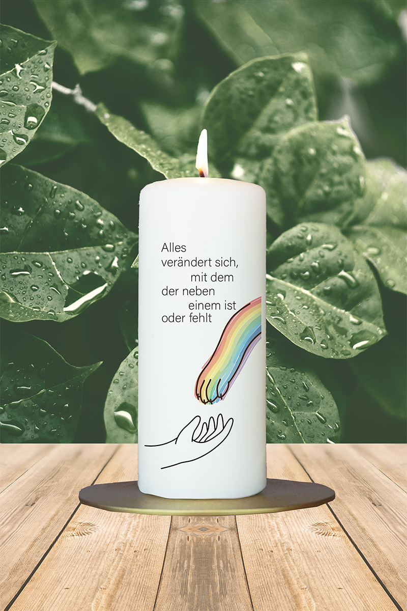 Ein Moment voller Zärtlichkeit: Die bunte Pfote auf einer menschlichen Hand steht für Nähe, Vertrauen und bedingungslose Liebe. Der Text bringt zum Ausdruck, wie tief der Verlust eines Tieres spürbar wird. Diese Kerze erinnert auf sanfte Weise daran, wie viel ein treuer Begleiter im Leben verändert hat – und wie sehr er fehlt.