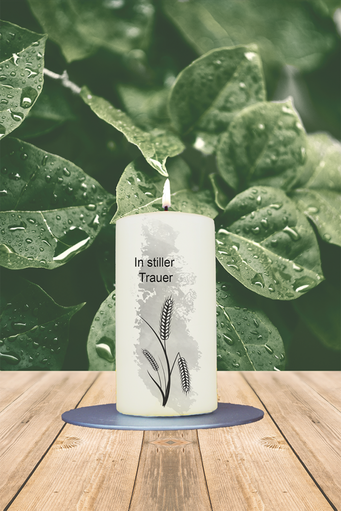 Schlicht, würdevoll und ausdrucksstark: Die Ähre als Symbol für das Leben, das zur Reife kam – und nun vollendet ist. Mit dem Text „In stiller Trauer“ bietet diese Kerze Raum für ehrliches Gedenken und einen ruhigen Moment des Abschieds.