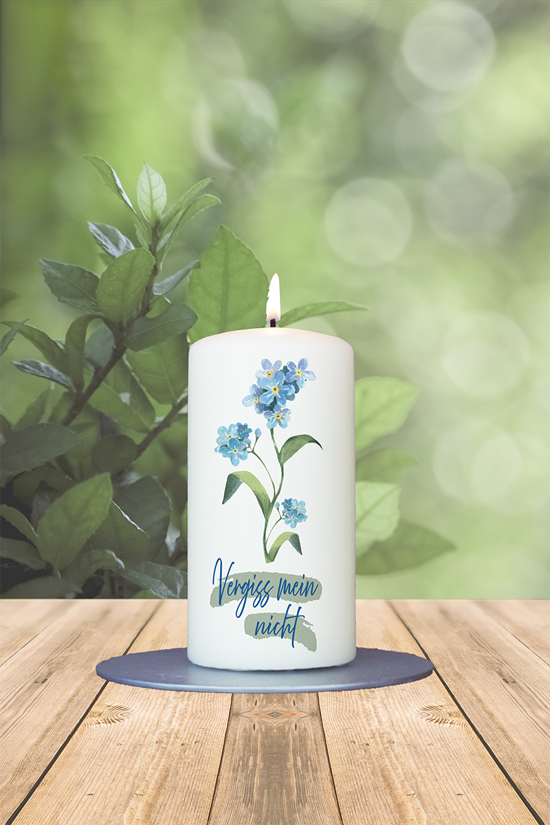 Zart und symbolstark: Die Vergissmeinnicht-Blüte steht für Erinnerung, Treue und bleibende Liebe. Diese Kerze bewahrt das Andenken an einen Menschen, der gegangen ist – und doch für immer im Herzen bleibt. Ein stilles, blühendes Licht gegen das Vergessen.