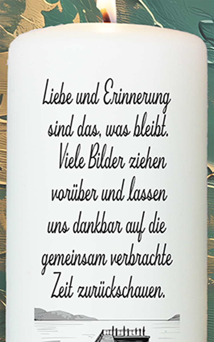 Ein Steg, der ruhig ins Wasser führt – Sinnbild für den Übergang. Der Text erinnert an gemeinsam verbrachte Zeit, die wie Wellen immer wieder ans Herz spülen. Diese Kerze schenkt Raum für Trauer, Dankbarkeit und stille Nähe. Mit Name und Daten personalisierbar