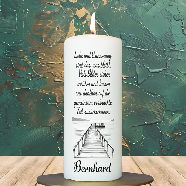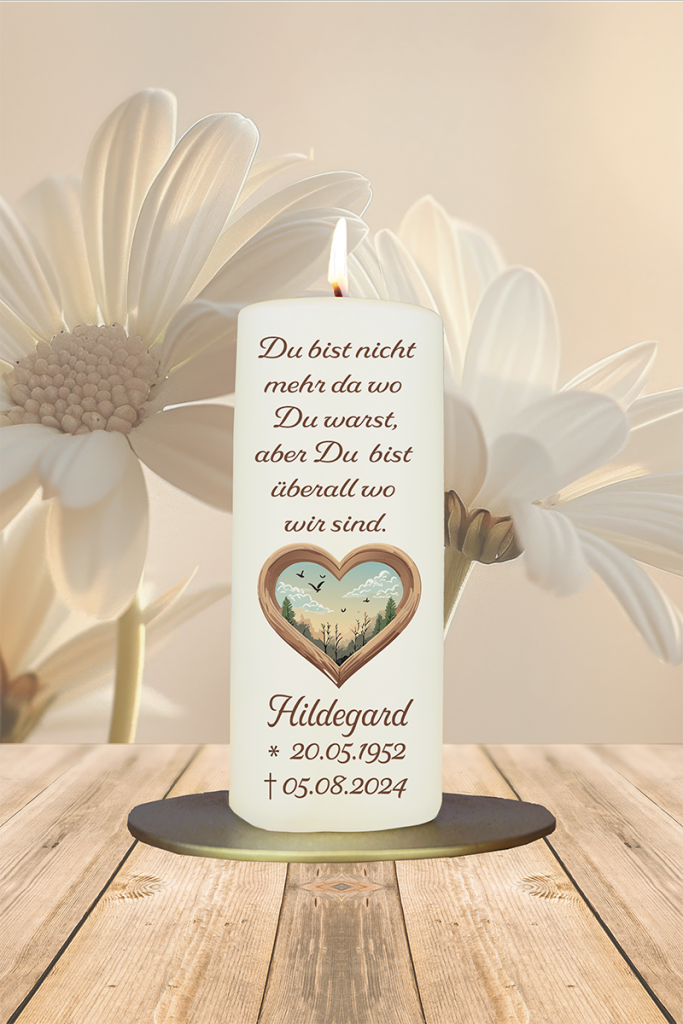 Diese Kerze vereint Natur, Weite und Geborgenheit: Das Herz aus Holz umrahmt eine Szene voller Leichtigkeit und Sehnsucht – mit Vögeln, Bäumen und einem stillen Sonnenaufgang. Der Text drückt aus, was viele fühlen: Ein Mensch ist gegangen – aber seine Liebe bleibt spürbar. Mit Name, Geburts- und Sterbedatum personalisierbar wird diese Kerze zum stillen, tröstenden Erinnerungslicht.