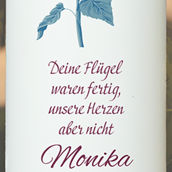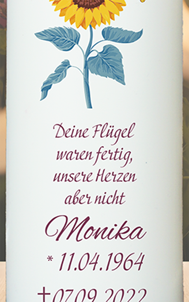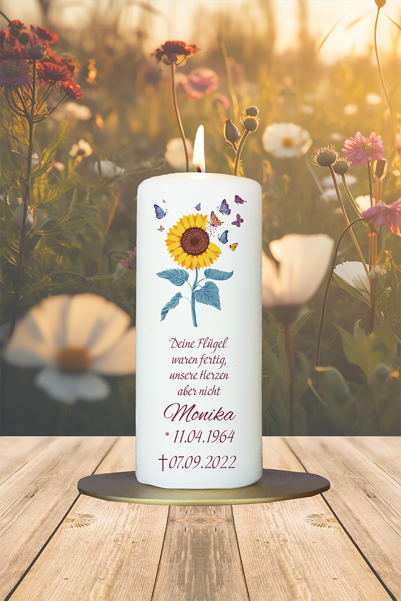 Die Sonnenblume steht für Licht, das bleibt. Die bunten Schmetterlinge erzählen vom Loslassen und der Verwandlung der Seele. Der Text bringt schmerzhaft schön auf den Punkt, wie schwer ein Abschied sein kann. Mit persönlicher Beschriftung wird die Kerze zu einem liebevollen Gedenken voller Farbe und Gefühl.