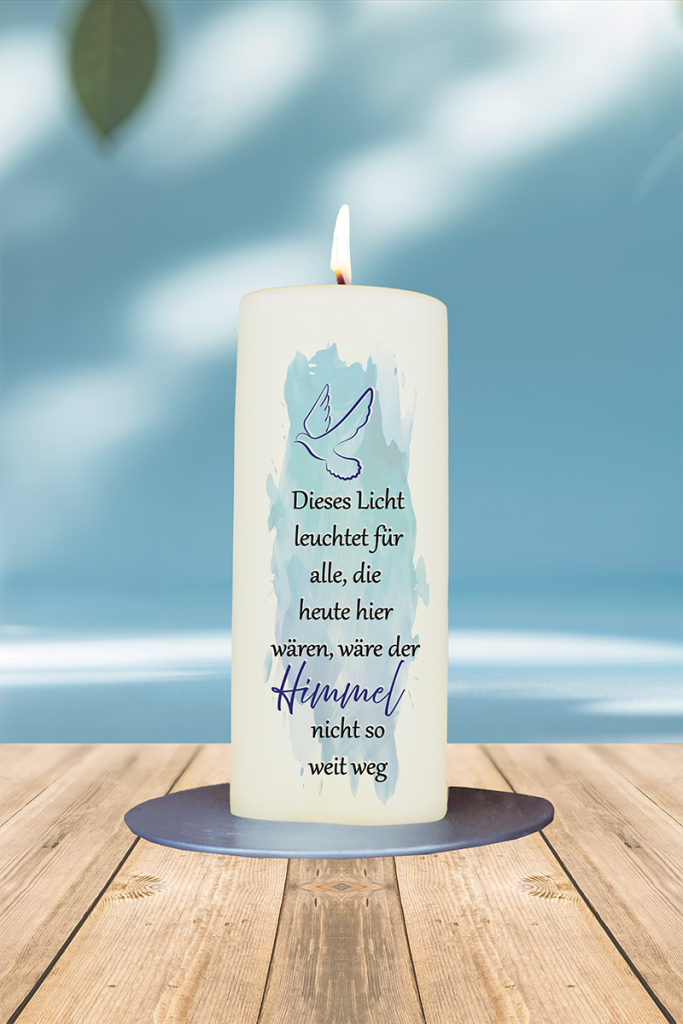 Diese Kerze bringt stille Verbundenheit zum Ausdruck – für alle, die fehlen, aber nicht vergessen sind. Die Taube steht für Frieden, das Licht für Erinnerung, der Text für Liebe, die weiterlebt. Ein leuchtender Platzhalter in stillen Momenten des Gedenkens.