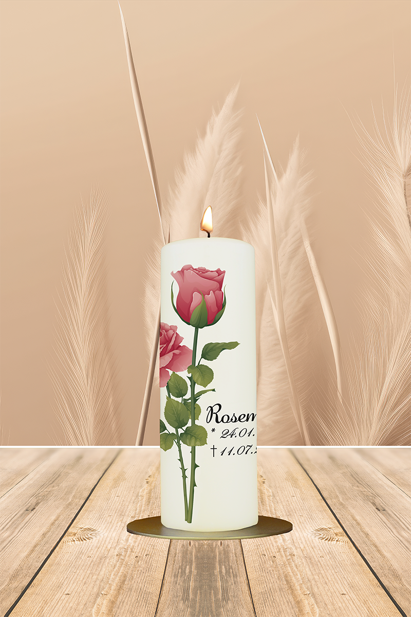 Die Rose, Symbol der Liebe und der Vergänglichkeit. Eine Blüte geöffnet, eine noch im Werden – wie Leben und Erinnerung nebeneinander stehen. Diese Kerze begleitet still, sanft und herzlich. Ideal für Gedenktage und liebevolle Momente der Erinnerung.
