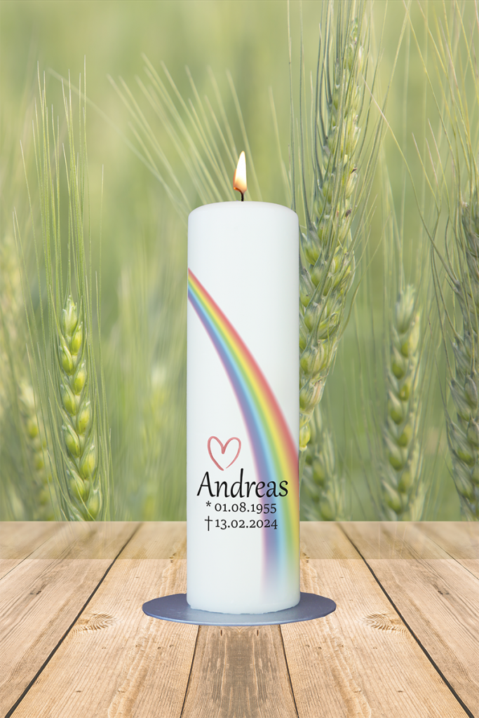 Der Regenbogen als Brücke, das Herz als Zeichen der Liebe – diese Kerze trägt beides. Sie sagt leise: Du bist nicht vergessen. Und mit der Personalisierung wird sie zu einem ganz eigenen Licht, das verbindet, was die Zeit trennt.