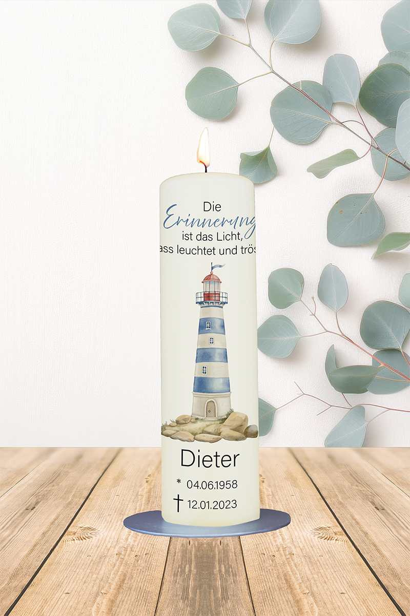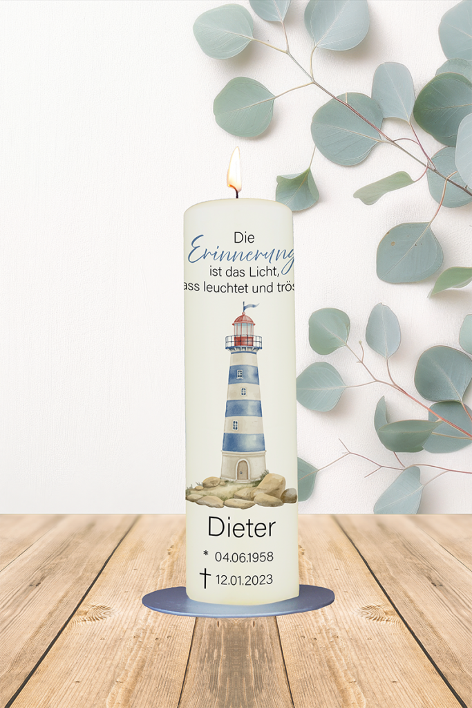 Ein Leuchtturm als Zeichen der Orientierung – auch in der Trauer. Der Text bringt Trost, indem er die Kraft der Erinnerung in den Mittelpunkt stellt. Eine maritime, lichtvolle Gedenkkerze für Menschen, die wie ein Leuchtturm waren: da, wenn man sie brauchte.