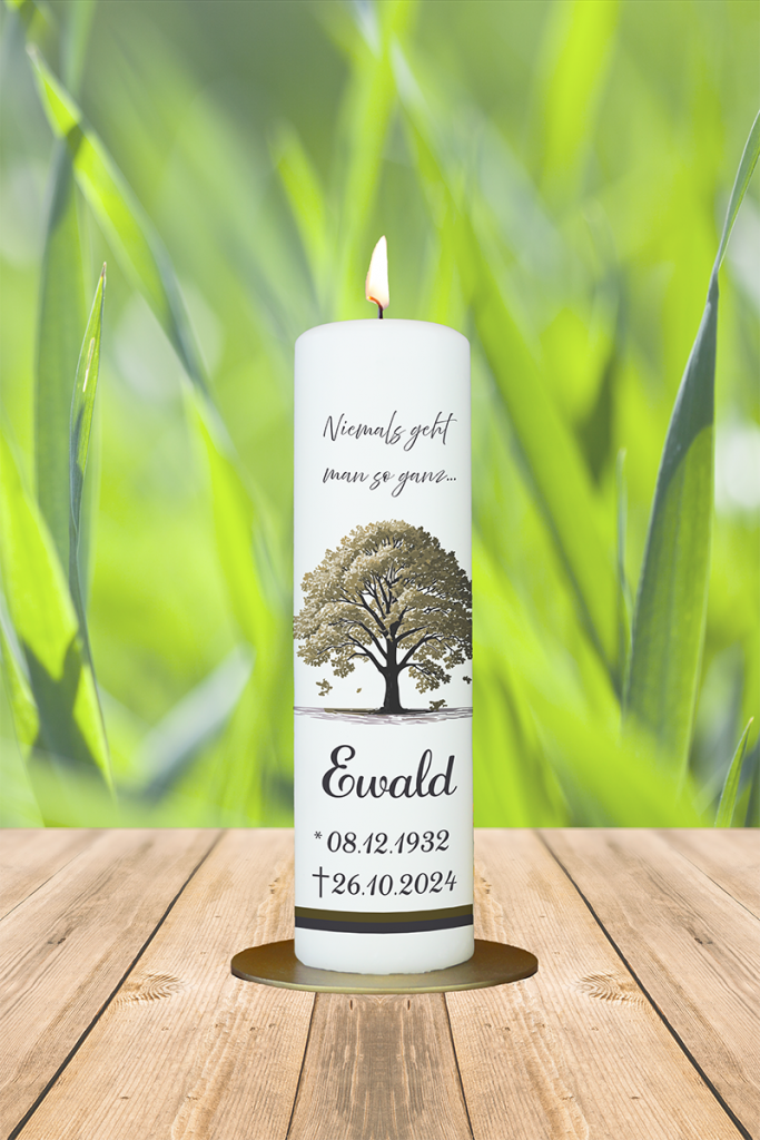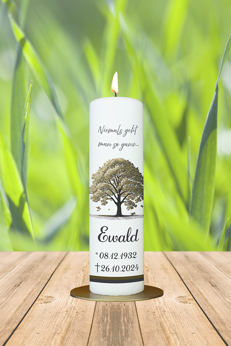 Die Eiche steht für Standhaftigkeit, für ein langes, erfülltes Leben. Der Spruch unterstreicht: Auch wenn ein Mensch gegangen ist, bleibt sein Wirken spürbar. Eine Kerze für all jene, die viel gegeben haben – und deren Spuren bleiben.