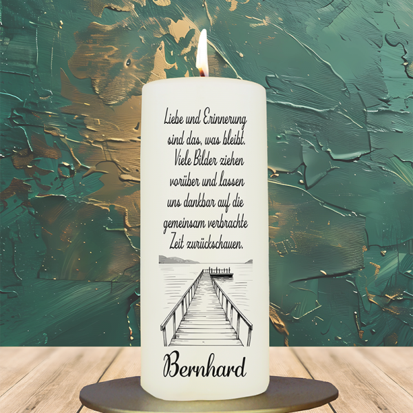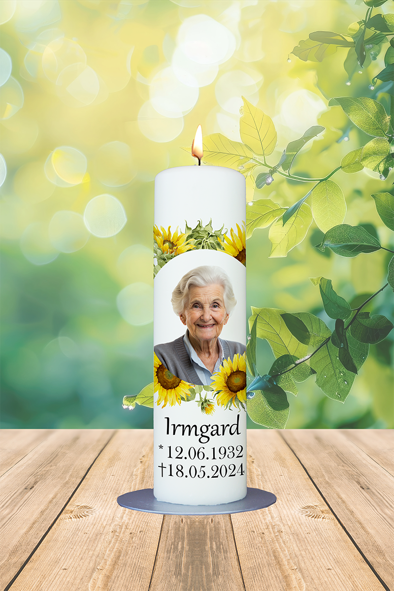 Sonnenblumen richten sich nach dem Licht – so wie unsere Gedanken sich nach den Menschen richten, die wir vermissen. Mit einem Foto und den Lebensdaten wird diese Kerze zum sonnigen, liebevollen Erinnerungsstück, das Trost und Farbe spendet.