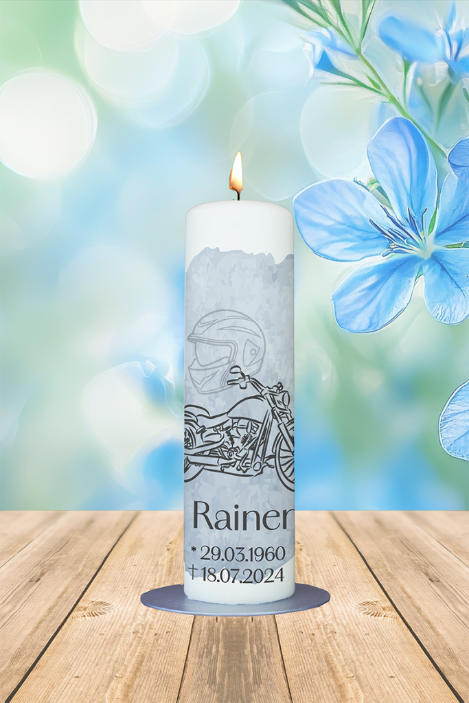 Diese Gedenkkerze für einen Motorradliebhaber zeigt mit Stil und Gefühl, wie man Leidenschaft, Abschied und Erinnerung verbinden kann. Der violette Hintergrund wirkt ruhig und edel, das Motiv spricht für sich. Mit Personalisierung wird daraus ein bleibendes Licht für jemanden, der jetzt auf anderen Wegen fährt.