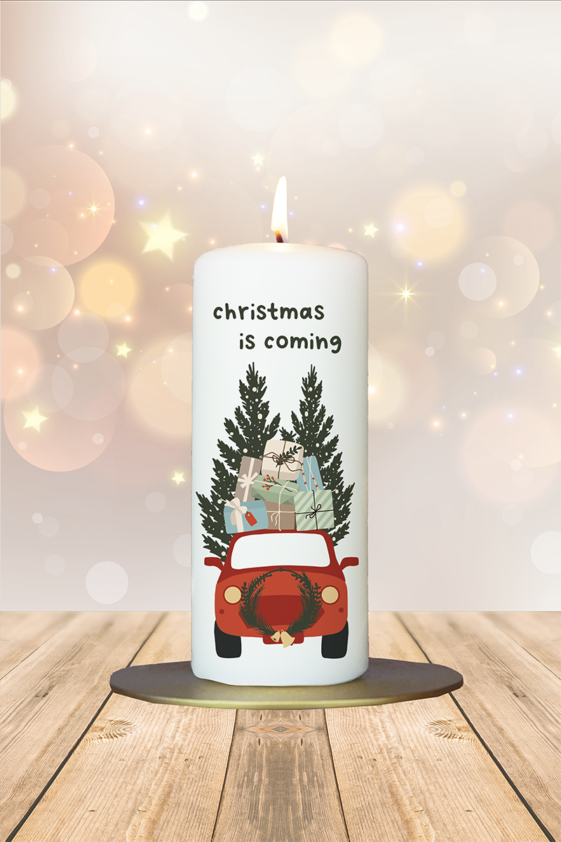 Bis unters Dach beladen mit Paketen und Weihnachtsbäumen rollt dieses nostalgische Auto durch den Winter – eine Szene wie aus einem Weihnachtsfilm. Der Text „Christmas is coming“ bringt Vorfreude ins Licht. Ideal für alle, die sich gerne auf den Weg ins Festglück machen.