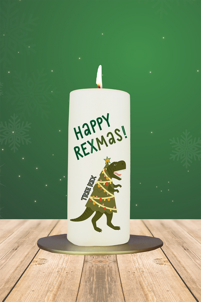 Ein Dino als Weihnachtsbaum verkleidet? Diese Kerze bringt Urzeit-Charme unter den Christbaum! Mit dem Spruch „Happy Rexmas – Tree Rex“ sorgt sie garantiert für Lacher – perfekt für Dino-Fans, Kinder oder alle, die das Fest mit Augenzwinkern feiern wollen.