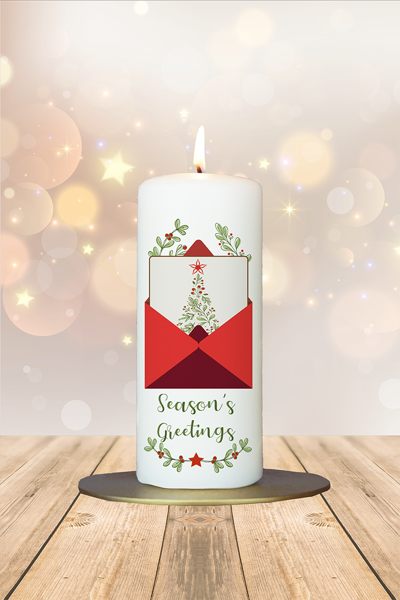 Ein kleiner Gruß mit großer Wirkung: Diese Kerze zeigt einen klassischen Briefumschlag mit liebevoller Weihnachtskarte – ein stilles Symbol für Verbundenheit und herzliche Wünsche. Der elegante Schriftzug „Season’s Greetings“ macht sie zum stilvollen Lichtgruß in der Adventszeit – besonders für Menschen, denen man aus der Ferne nahe sein will.
